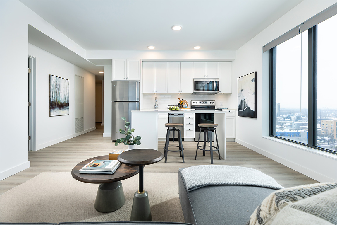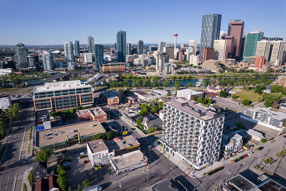 The Annex, completed in 2021, was a success: located in the Kensington community just north of the Bow River, the building was Alberta's first LEED Gold-certified multifamily midrise. This experience set the stage for continuing the partnership with PCL. The developer had acquired some undeveloped property northeast of downtown Calgary, and in 2019, development began moving forward. Minto commissioned a multi-structure mixed-use development design with 220 total suites for the site, which would become Era.
