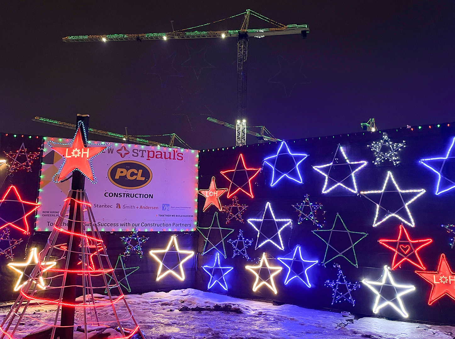 Over at the new St. Paul’s Hospital construction site, the PCL team has flipped the switch on a holiday display of its own. It’s a 1,500 square foot structure decorated with 60 bright, colorful stars and a 12-foot light-swirled tree with a Lights of Hope topper. Look up and you’ll see a 20-foot campaign sign with a donation link and the site’s four cranes lit up in holiday hues.