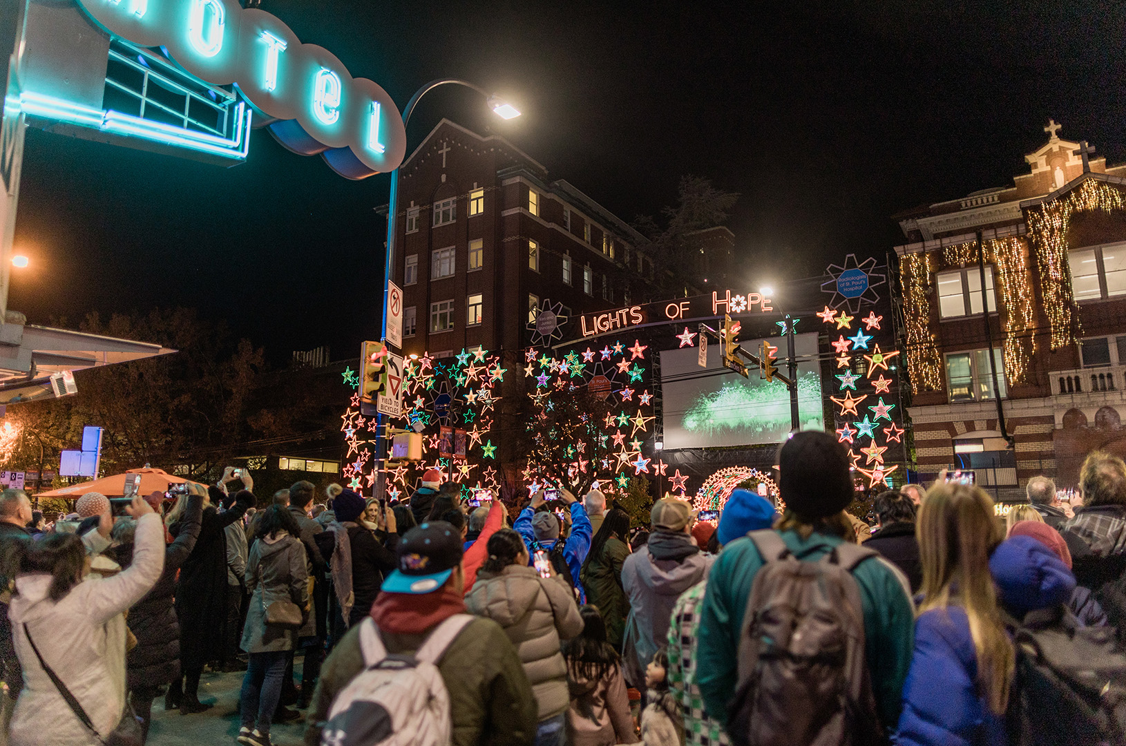 Lights of Hope is a holiday tradition that delights thousands of visitors each year while raising money to support exceptional patient and residential care across British Columbia. The attraction is a joyful fusion of twinkling stars and thousands of lights that adorn the current St. Paul’s Hospital façade downtown along Burrard Street.