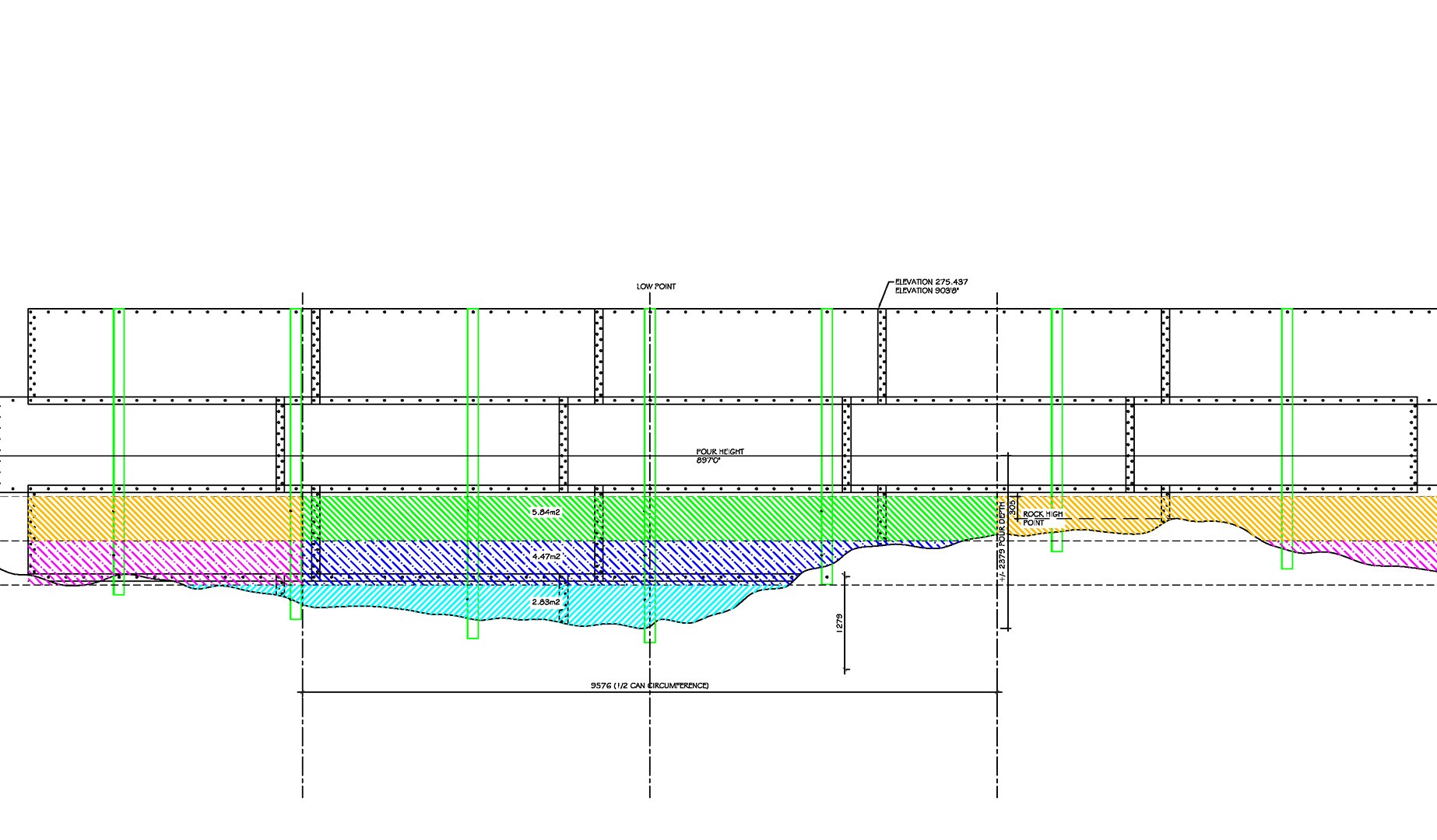 “For each of the GPS data points we calculated an azimuth angle from the center of the can relative to the face of the dam,” he explains. “Using the associated arc distances, we were able to graph the rock profile around the circumference of the can at the design location. By overlaying the bolt pattern of the can over the profile, we were able to scribe the profile directly to the can simply by measuring up from the bottom at each bolt hole location.”