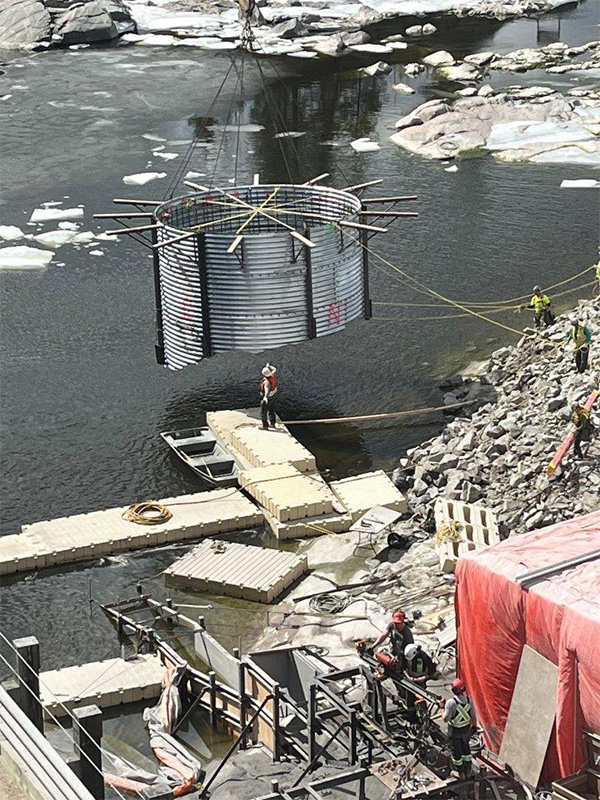 PCL’s solution was a combination of technology and human ingenuity. Brad Mackid decided the easiest way to pour the concrete base was to drop a large metal can — 20 feet in diameter, 34 feet in height — into the river to act as formwork.
