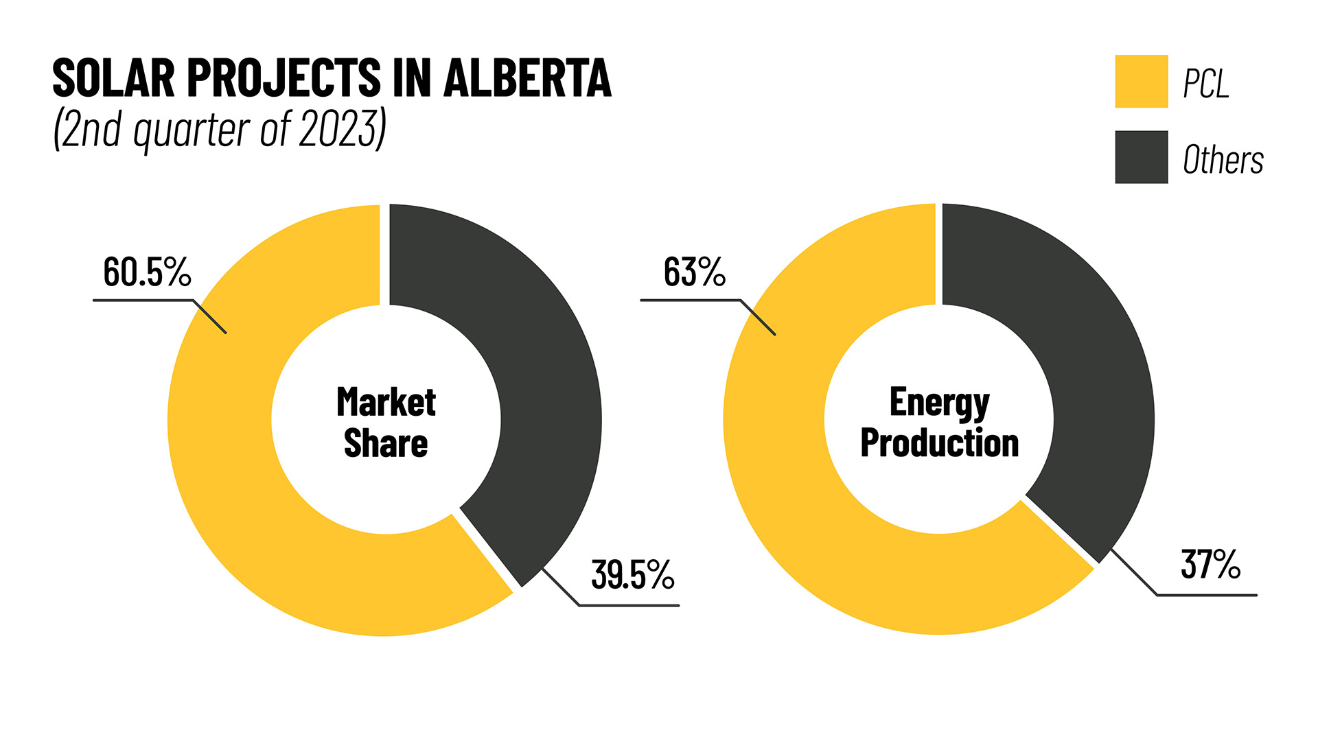 As of the second quarter of 2023, PCL Solar had built 60.5% of the solar projects (by nameplate capacity) in Alberta, Canada. Those facilities produced 63% of the solar electricity in the province, giving a higher-than-average capacity factor. Travers Solar consistently has the best average capacity factor of any project in the province.