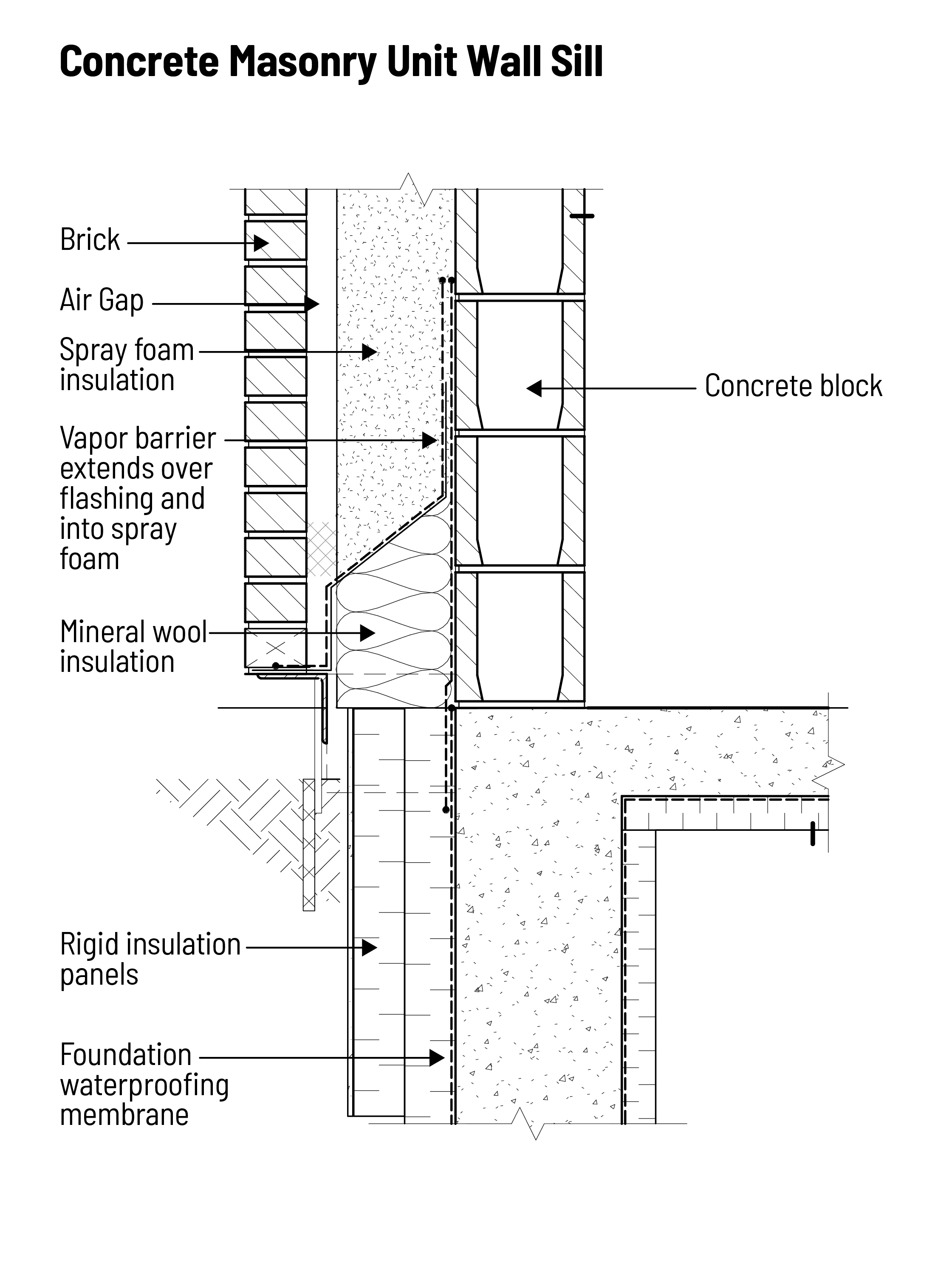 A net-zero building requires a tight building envelope. In the case of the Windermere Fire Station, the wall included a 90mm brick veneer, a 45mm air space, 175mm of spray foam insulation and vapor barrier and a 190mm concrete block wall. It provides an excellent U-Value of 0.167 W/m2K.