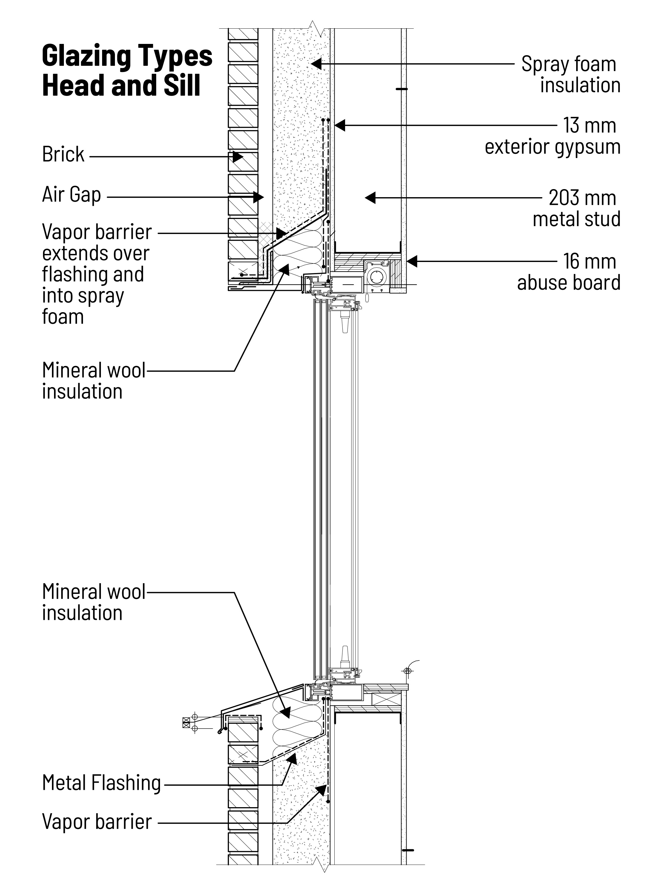 The triple-glazed windows are set in walls made of 90mm brick veneer, a 45mm air space, 175mm of spray foam insulation and vapor barrier, 13mm exterior gypsum sheathing, 203mm metal stud framing and 16mm abuse board, giving an excellent solar heat-gain coefficient rating of 0.38.