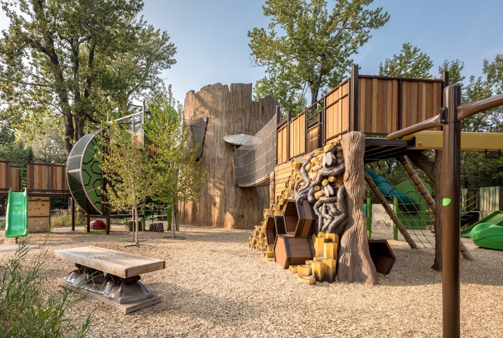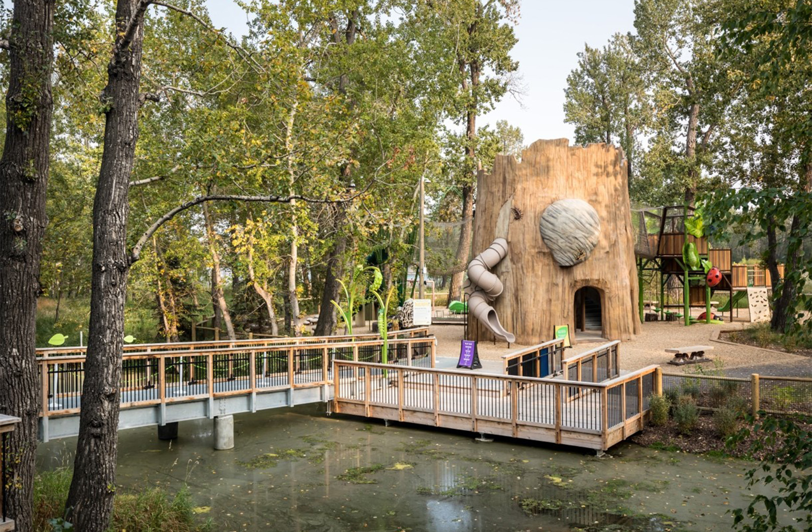 In partnership with Calgary design-build fabricator F&D Scene Changes, PCL’s Special Projects team constructed an interactive nature-themed play space that offers children of all ages an exciting introduction to the beautiful world of bugs. Opened in 2020 after one year of construction, the project features a 30-foot-tall prefabricated tree trunk connected to three nearby towers through a series of rope bridges. Visitors are immediately immersed in nature as soon as they step inside the interactive play space, as the structures are thoughtfully adorned with various insects, including ladybugs, caterpillars and bees.