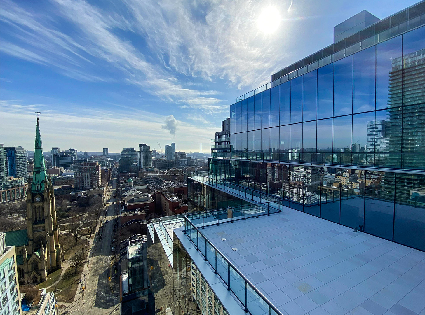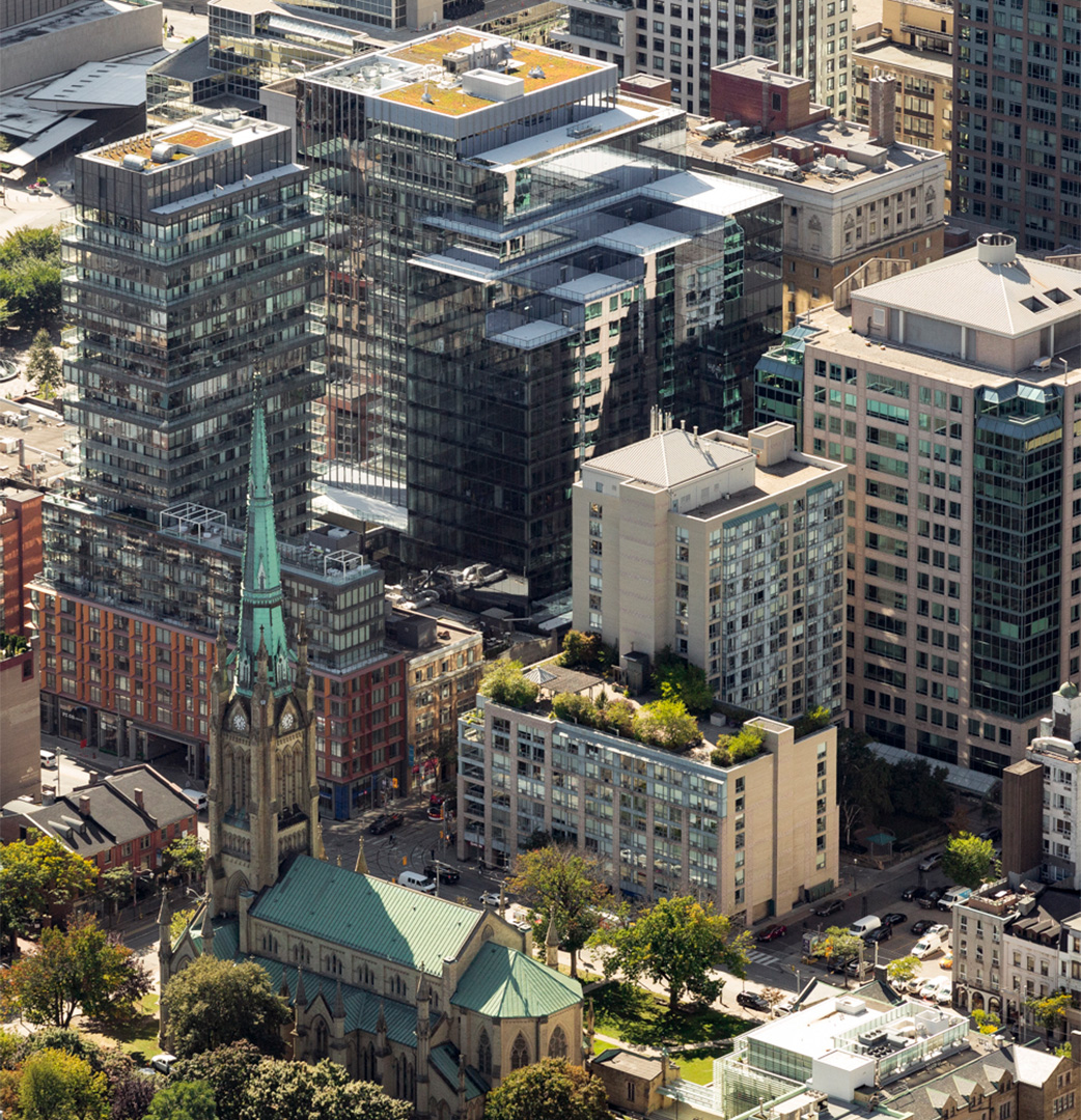65 King East was built with sustainability and tenant well-being in mind and has achieved Gold Certification in Leadership in Energy and Environmental Design (LEED) from the Canadian Green Building Council. The design focuses on creating a healthy and safe place that enhances the tenant experience. Floor-to-ceiling windows are key elements that enhance natural sunlight and stunning views. Additionally, highly efficient dimmable LED lighting with daylight occupancy and motion sensors help reduce energy consumption throughout the building. Eight private terraces, rare to most high-rise structures downtown, are a standout feature of the tower, along with a green roof. The design also integrates in-floor heating, ventilation and air conditioning (HVAC) with exposed concrete ceilings to improve air quality throughout the building.