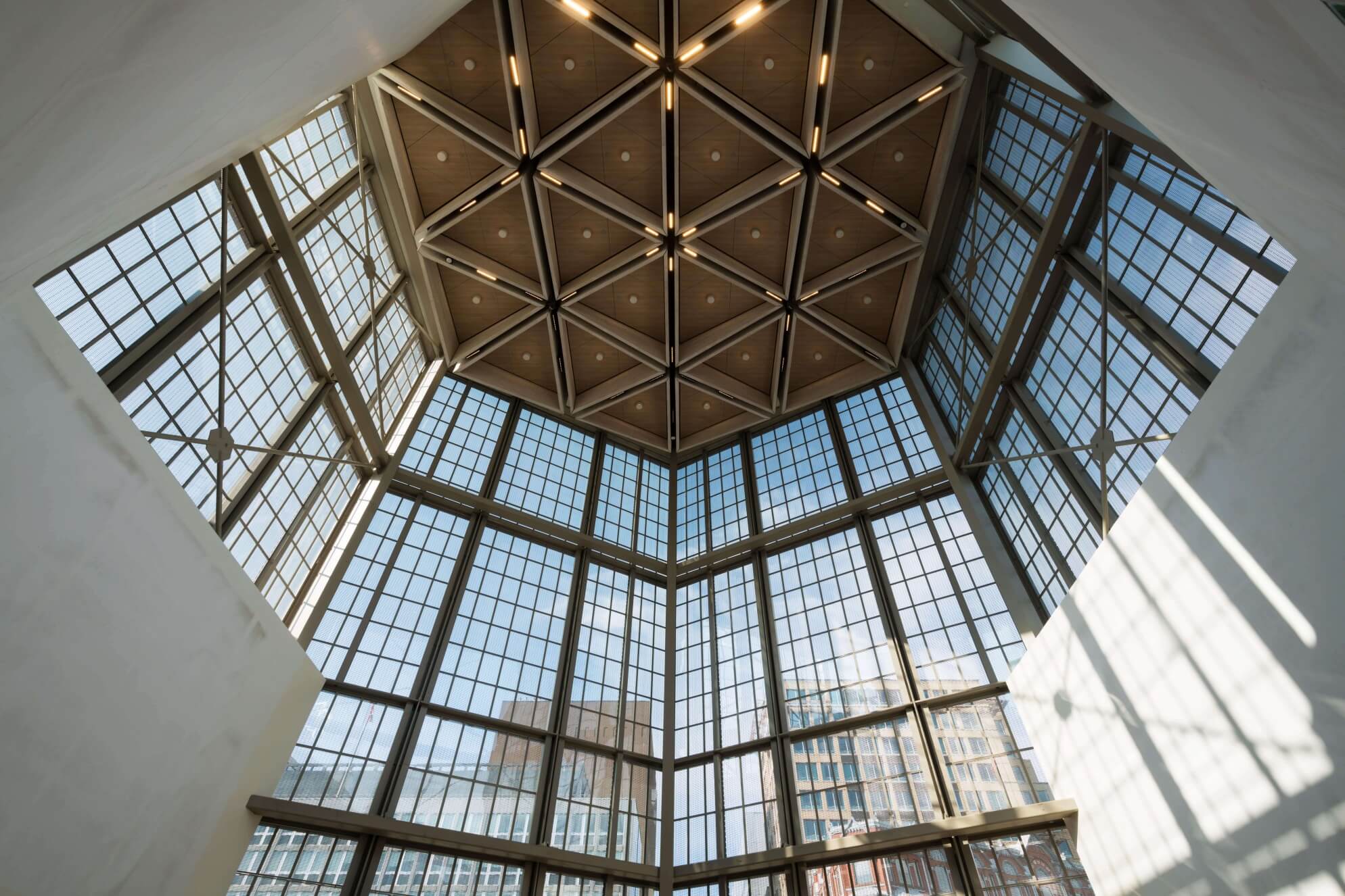 The NAC rejuvenation features large quantities of manufactured glulam (glue-laminated lumber) coffers throughout most of the public spaces. PCL, in collaboration with the design team and the specialist glulam contractor, prefabricated the individual roof panels and incorporated all mechanical, life safety, electrical infrastructure, and finished wood ceiling panels on the underside, and the finished roof membrane on the exterior topside.