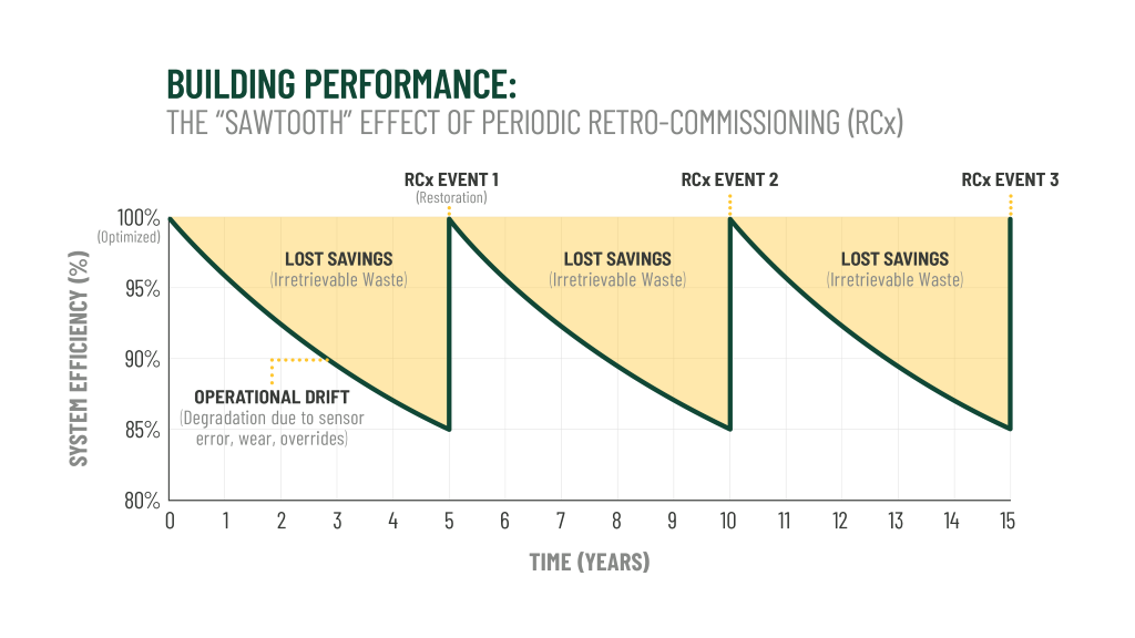 The traditional approach to building performance — retro-commissioning every three to five years — results in a phenomenon known as the "sawtooth effect." While retro-commissioning can successfully restore building performance, research indicates that these gains are short-lived. Without continuous monitoring, performance begins to drift almost immediately, resulting in significant lost savings over time.