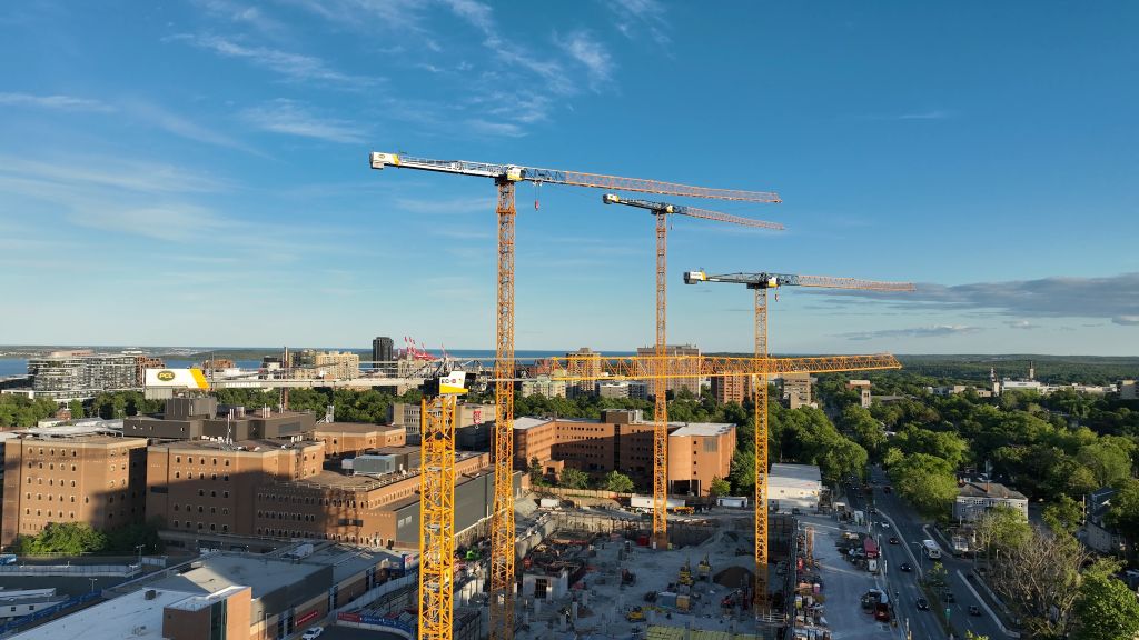The Nova Scotia project required a crane to stand 105 meters — a height made possible by using the tower crane manufacturer’s heavy mast sections along with its current generation of versatile tower cranes.