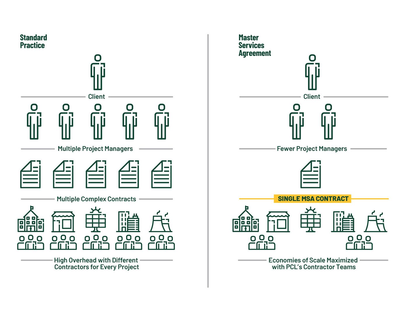 Available for most project types, PCL’s Master Services Agreements are crafted to accommodate unique client requirements by combining multiple projects – as many as 50 or more – under one multi-year contract. This consolidated project delivery process builds trust and reliability with clients by leveraging economies of scale in the procurement of labour and materials, leaning processes and reducing redundancies, all of which help to improve schedules and reduce costs.
