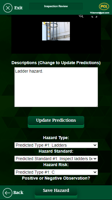 “The intention of the app is to identify hazards in the field quickly and get them resolved right away,” said Tyler Ciarroni, HSE business analyst with PCL. “Other inspection forms can have over 30 data entry points, so completing an inspection can be a time-consuming process. This app allows workers to address any hazard on the spot.”
