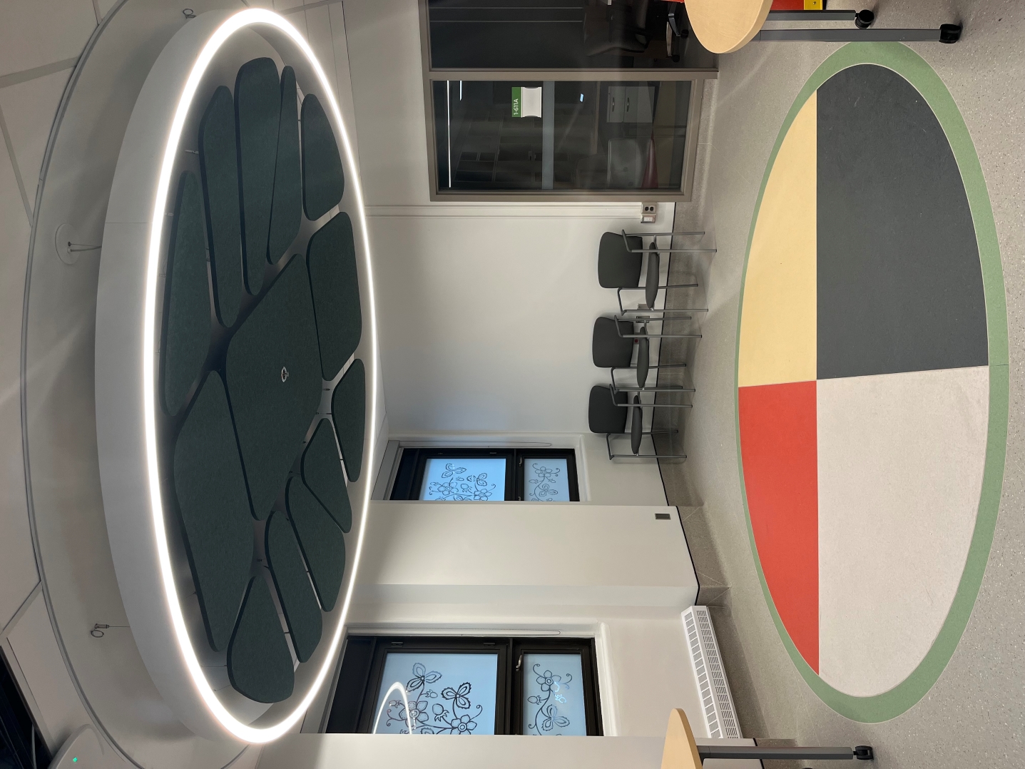 Above the ceremonial circle, the team installed a feature felt ceiling that references a turtle shell. The turtle is a sacred icon in many Indigenous cultures, symbolizing the earth for some cultures, and representing healing, spirituality, longevity and life for others. To illuminate the ceremonial circle, the team installed an LED ring light around the shell.