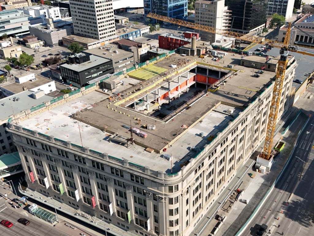The redevelopment is a massive undertaking. The century-old building has a heritage designation, and certain aspects of the hardwood flooring, window structures, stairwells, doors and exterior Tyndall stone are protected. PCL crews must respect rigorous protocols to protect the heritage features. “It’s a complexity level that I have never seen before on a project,” adds Fontaine.