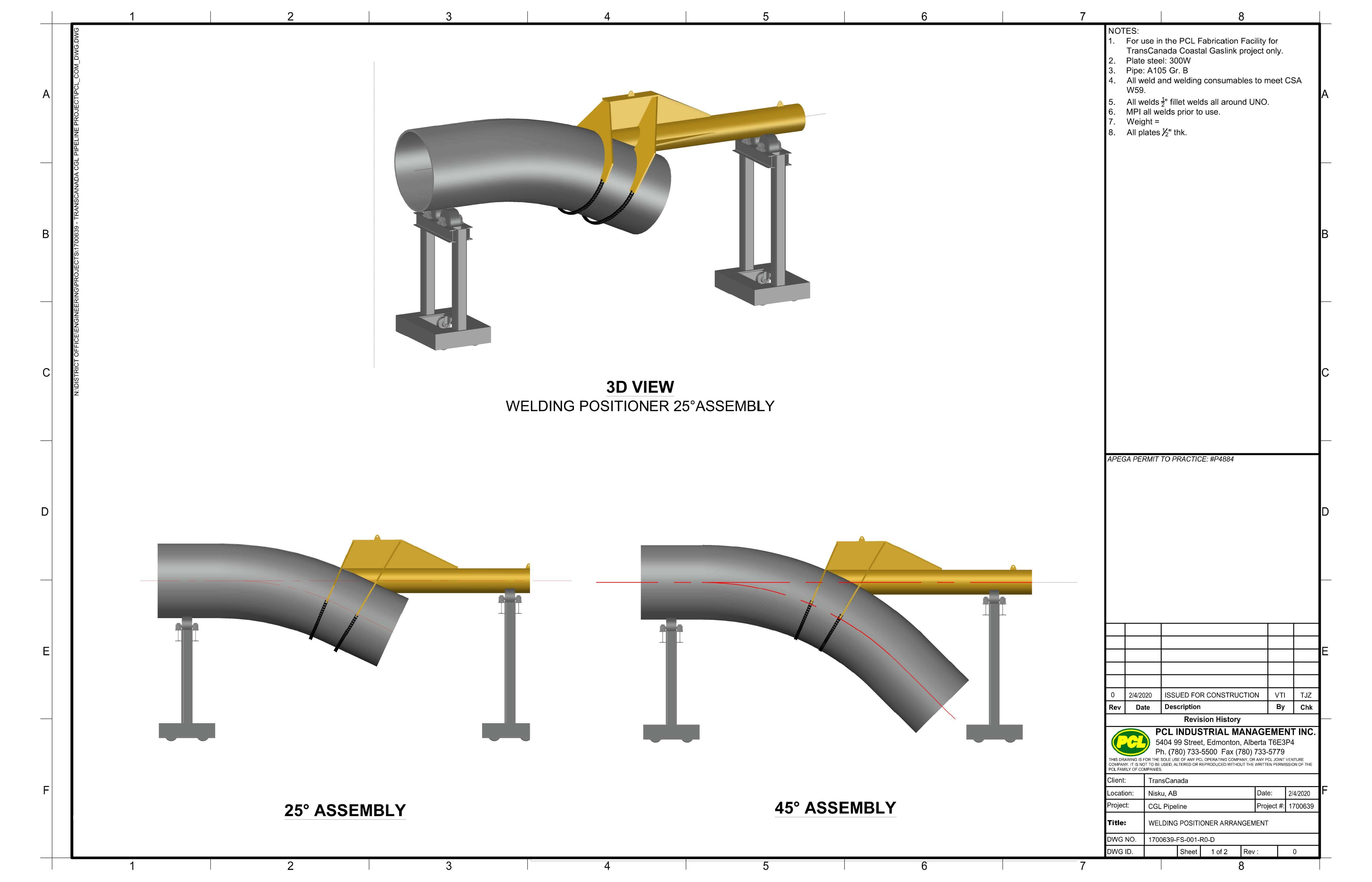 The engineered design for the elbow clamp featured a rigid connection between the pipe elbow and the clamp so that it would remain immobile as the pipe was rolled for welding. For the clamp to fit properly on the varying degree of elbow bends, two different sizes of the elbow clamps were fabricated. For the larger radius bends, custom extensions to the pipe stands were also built to raise the elbows higher from the floor, as the elbows were up to 21 feet long.