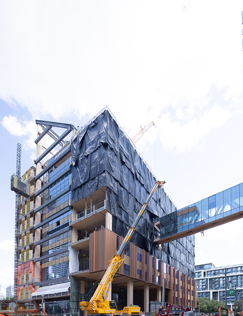 Limberlost Place’s structure was completed using an intricate installation method including a sequence where each mass timber column and cross-laminated slab band would be placed. The structure includes three, three-storey mass timber columns which are amongst some of the largest in North America.