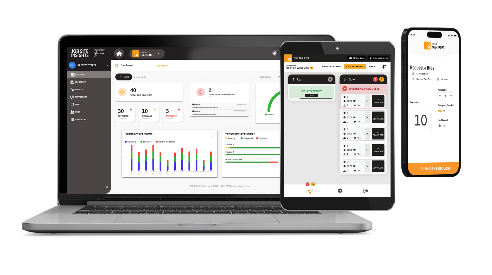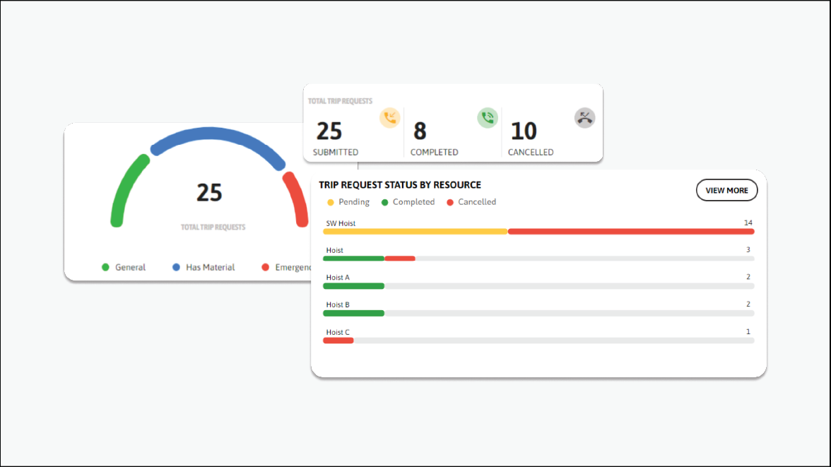 Trip requests are queued in real-time to the operator’s tablet, showing where requests are waiting and going. This allows operators to focus on running the hoist instead of constant interaction with the workforce.