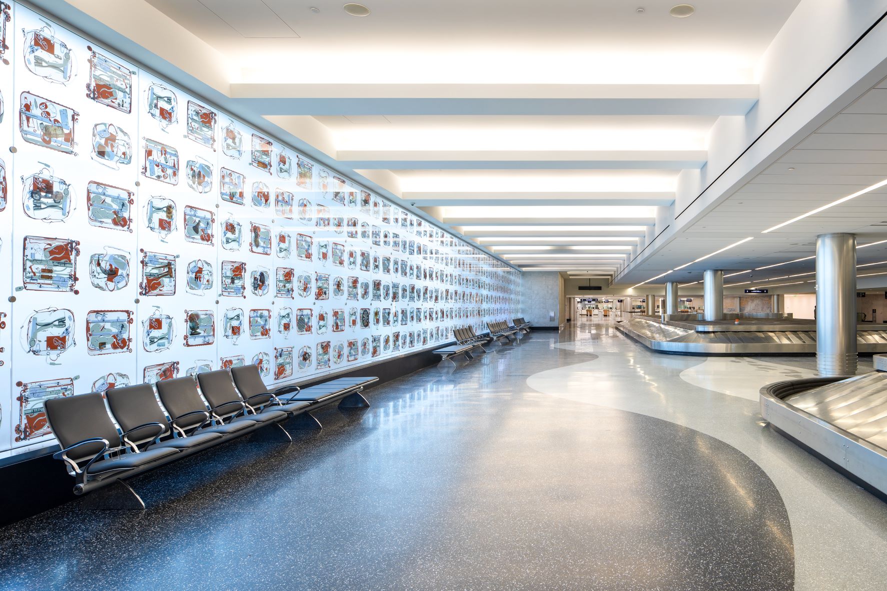 Featured artwork piques the interest of passengers with a few minutes to spare. PCL has worked with the San Diego County Regional Airport Authority over the past 10 years, installing several commissioned artworks in the Terminal 2 Expansion at the San Diego International Airport, including a 700-foot-long purple overhead LED light display called The Journey that guides travelers through the terminal, and Taxonomy of a Cloud, a suspended ceiling sculpture made from aluminum tubing and 365 strands of Swarovski crystal that look like falling raindrops. While constructing the San Diego International Airport’s Federal Inspection Station, PCL installed a 300-foot-long glass art wall called Carry On, which displays hundreds of photos and images of personal objects superimposed over abstracted X-rays of carry-on bags. The display brings to mind stories about artifacts found in the luggage of travelers.