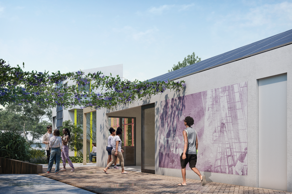 This included incorporating a “food forest” where edible plants mimic a natural ecosystem, installing solar panels and cisterns for water capture and storage, and integrating local artwork into highly visible exterior spaces, all features designed to be approachable and replicable in residents’ own homes.