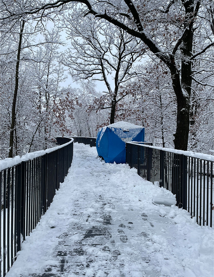 The team needed to find a way to warm tradespeople without them getting down off the trail. After deliberating several ideas, they opted to use ice fishing houses. The houses are placed on sections where the trail width expands from eight to 12 feet and can accommodate up to four people.