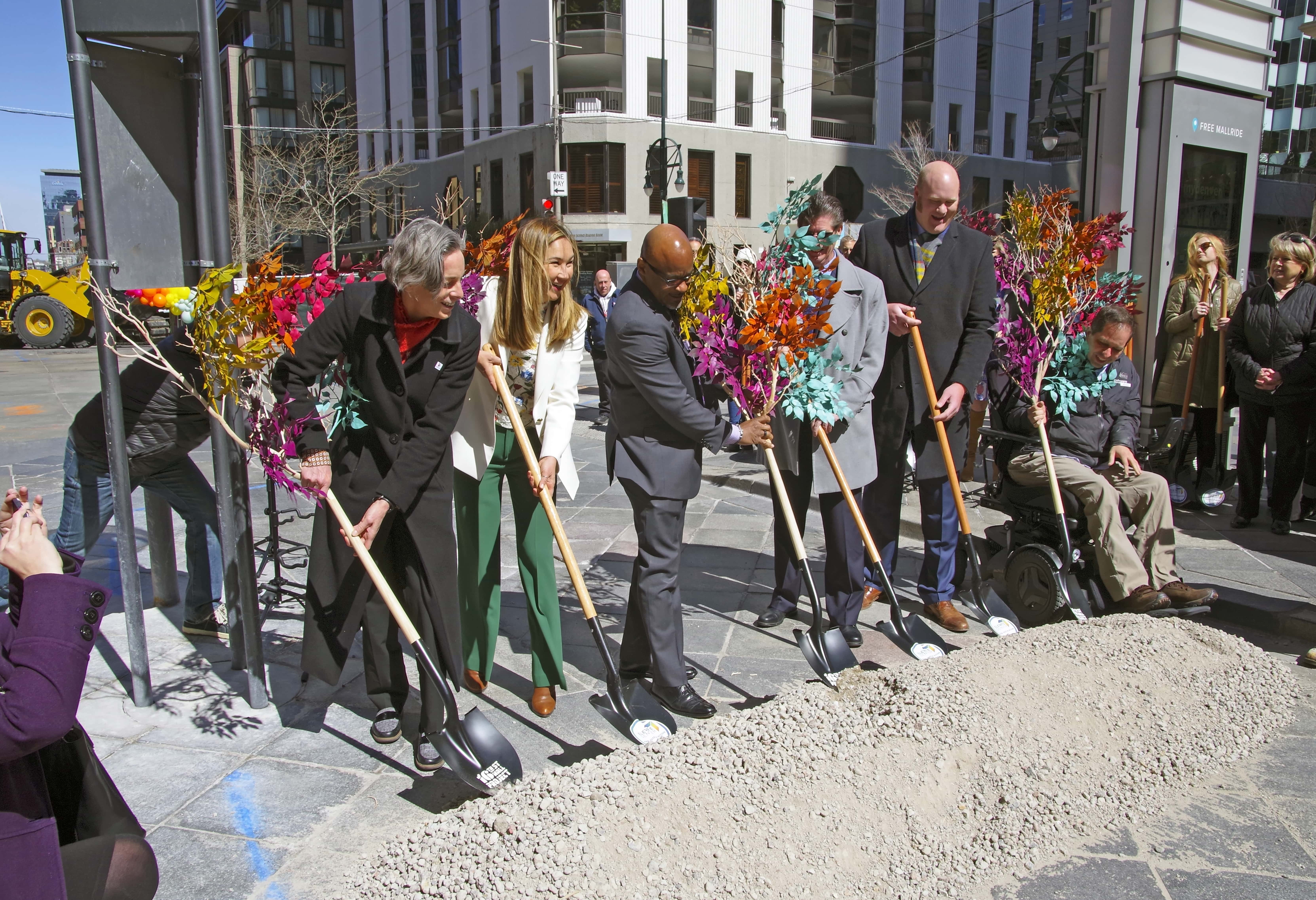 DENVER, April 14, 2022 – Denver’s 16th Street Mall is open for business, and a project to breathe new life into the iconic pedestrian destination is now underway. In April, Denver Mayor Michael B. Hancock gathered with downtown residents and businesses, representatives of the Downtown Denver Partnership, Regional Transportation District (RTD) and Denver Urban Renewal Authority to officially launch the 16th Street Mall Project, breaking ground with decorative shovels indicative of the colorful design materials that will be a hallmark of the project.